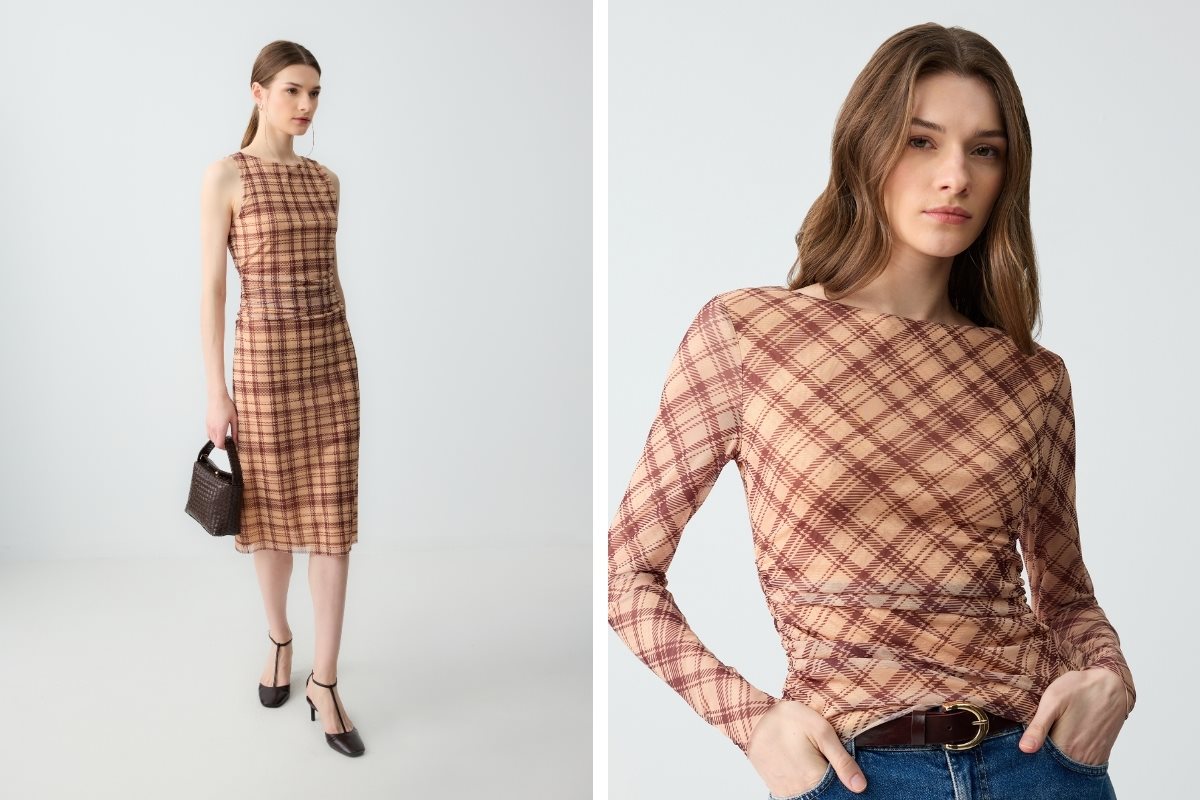Klasik ekose desenler, mesh kumaşlarla birleşerek dinamik ve sofistike bir görünüm yaratıyor. Ofisten hafta sonu stiline kadar geniş bir kullanım alanı sunan bu parçalar, rahat şıklığı seven kadınların dolaplarında kendine yer buluyor.