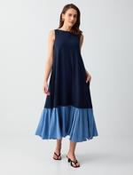 • Women Dark Blue Boat Neck Sleeveless Color Blocked Knitted Midi Dress