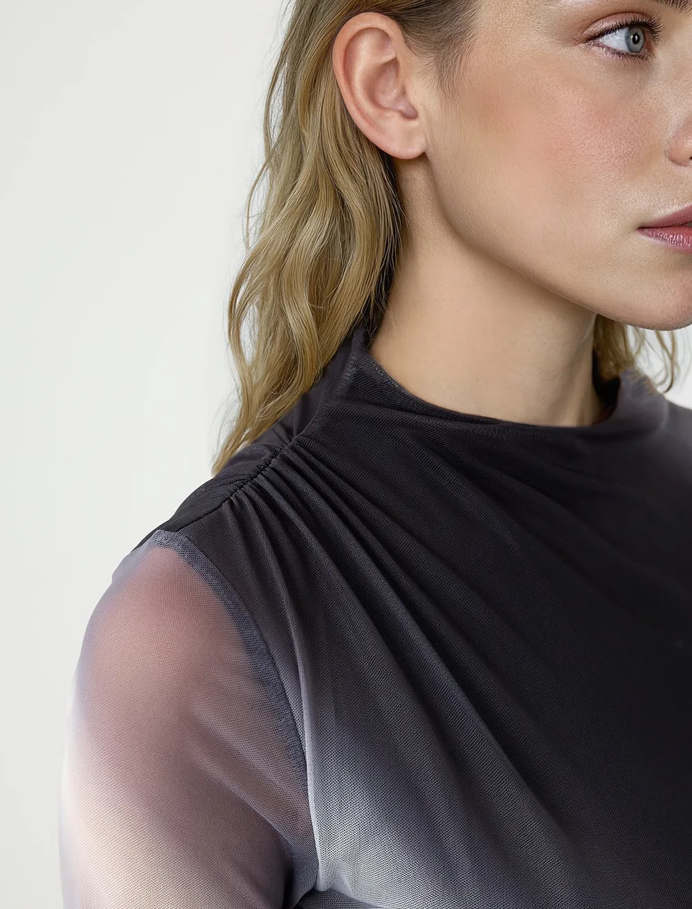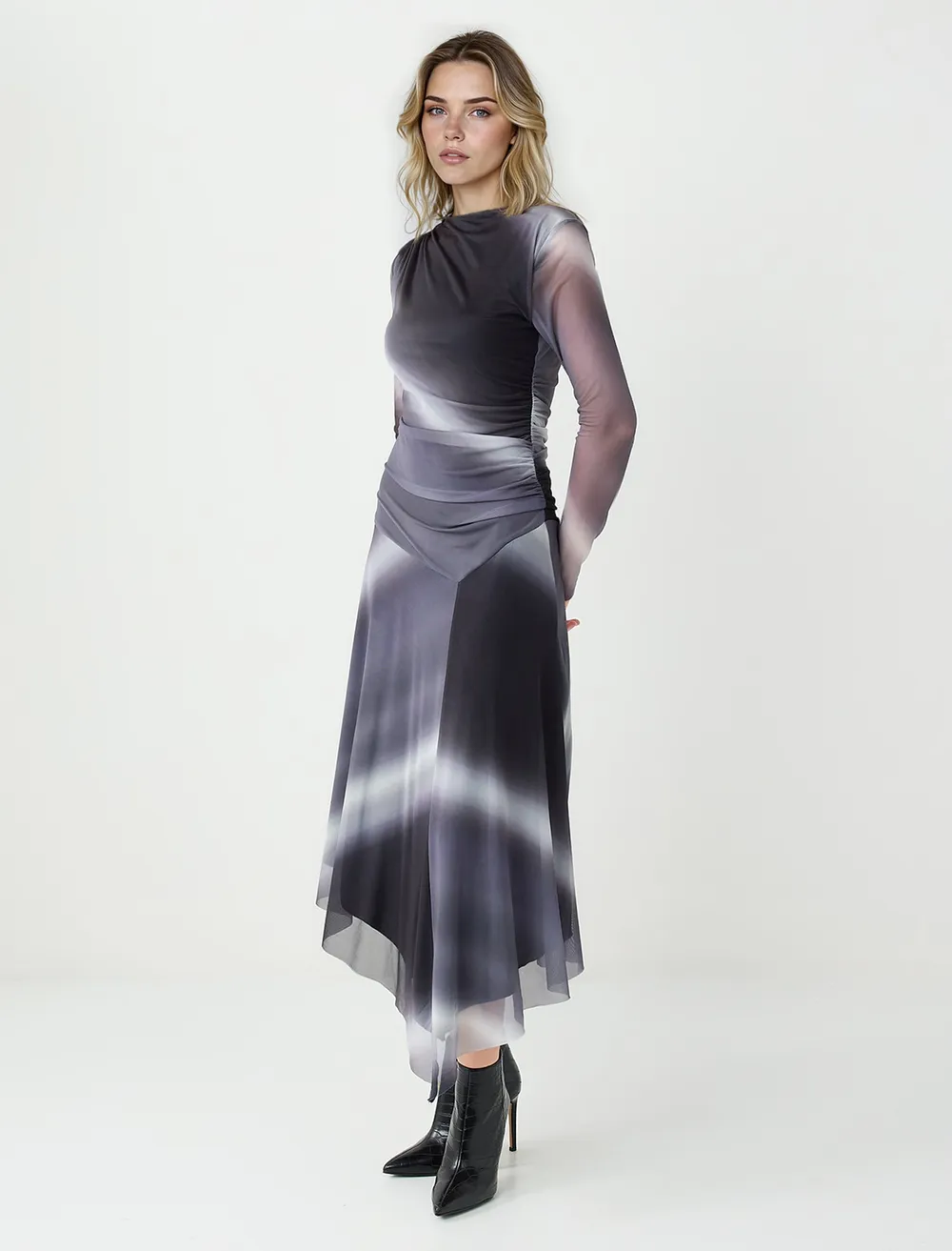 Gray Round Neck Long Sleeve Patterned Mesh Midi Dress