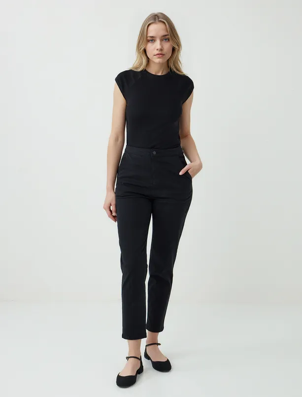 • Women Black High Waist Regular Leg Woven Pants with Side Pockets