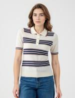 Ecru Shirt Collar Striped Short Sleeve Knitted T-Shirt