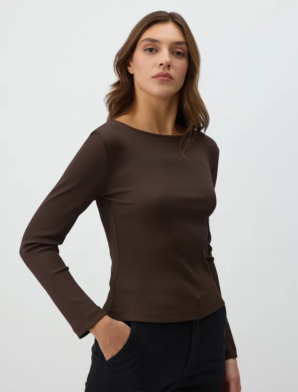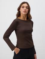 • Women Brown Slim Fit Boat Neck Knitted Blouse