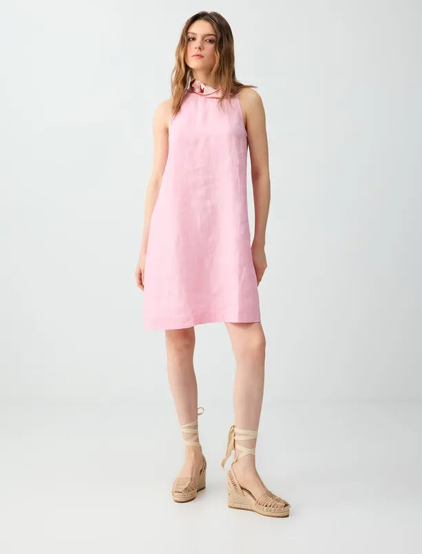 Pembe %100 Keten Kolsuz Bisiklet Yaka Mini Elbise
