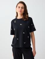 • Bayan Siyah %100 Pamuk Bisiklet Yaka Kısa Kollu İncili Örme Tişört