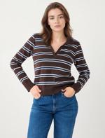 • Bayan Kahverengi %100 Pamuk Gömlek Yaka Çizgi Desenli Örme Tişört
