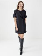 • Bayan Siyah Bisiklet Yaka Düğme Detaylı Dokuma Mini Elbise