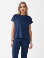 • Bayan Lacivert Bisiklet Yaka Kısa Kollu Şerit Detaylı Örme Tişört