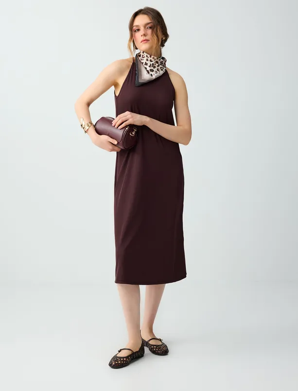 • Bayan Kahverengi Bisiklet Yaka Kolsuz Bol Kesim Basic Örme Elbise
