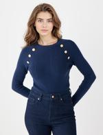 • Bayan Lacivert Dar Kesim Bisiklet Yaka Metal Düğmeli Triko Kazak