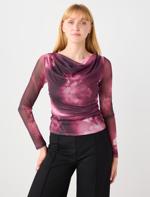 Pembe Dar Kesim Dökümlü Yaka Desenli Örme Mesh Bluz