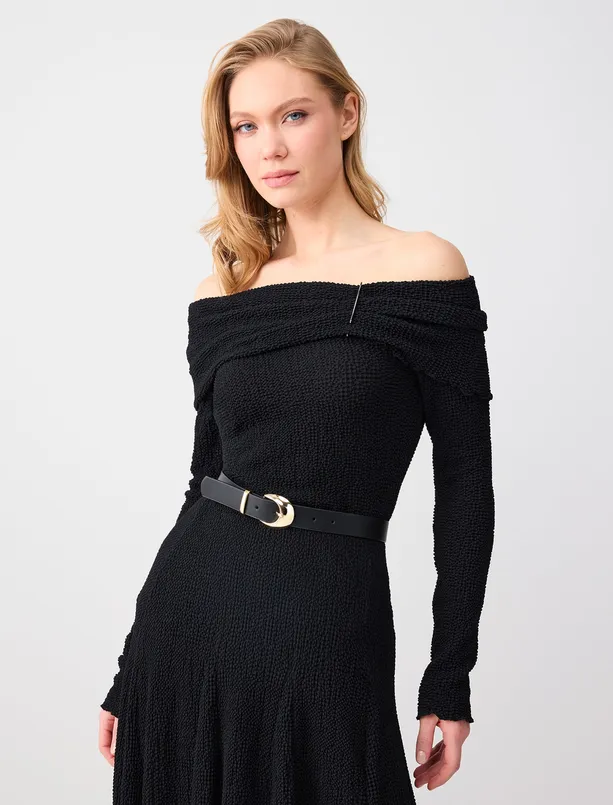 • Bayan Siyah Dar Kesim Dökümlü Yaka Kemer Detaylı Örme Bluz