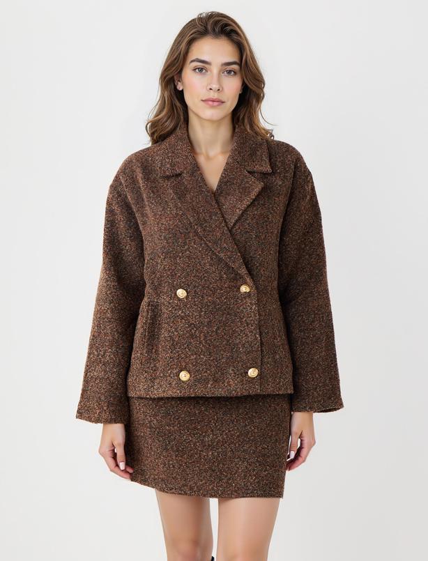 Kaşe dokuma yüzeyiyle formunu koruyan bu mini siluet, dar kesimi sayesinde modern ve dengeli bir görünüm sunar. Minimal tasarımı farklı üst parçalarla kolayca uyum sağlayarak şehir stiline güçlü bir dokunuş katar.