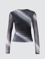 Gri Dar Kesim Sıfır Yaka Renk Geçişli Mesh Bluz