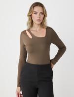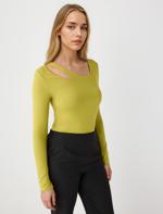 Yağ Yeşili Dar Kesim Uzun Kollu Asimetrik Yaka Örme Bluz