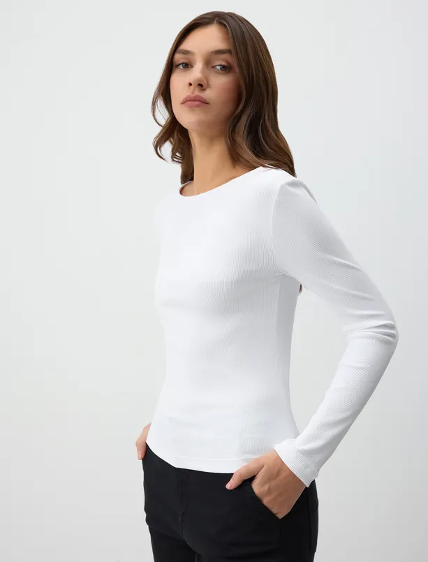 Ekru Dar Kesim Uzun Kollu Kayık Yaka Örme Bluz