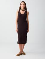 • Bayan Kahverengi Dar Kesim V Yaka Kolsuz Midi Örme Elbise
