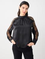• Bayan Siyah Dik Yaka Kollu Dantel Detaylı Saten Dokuma Bluz