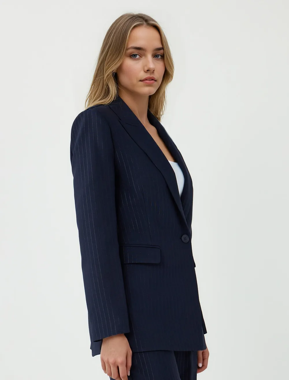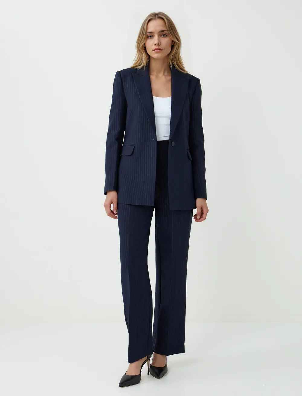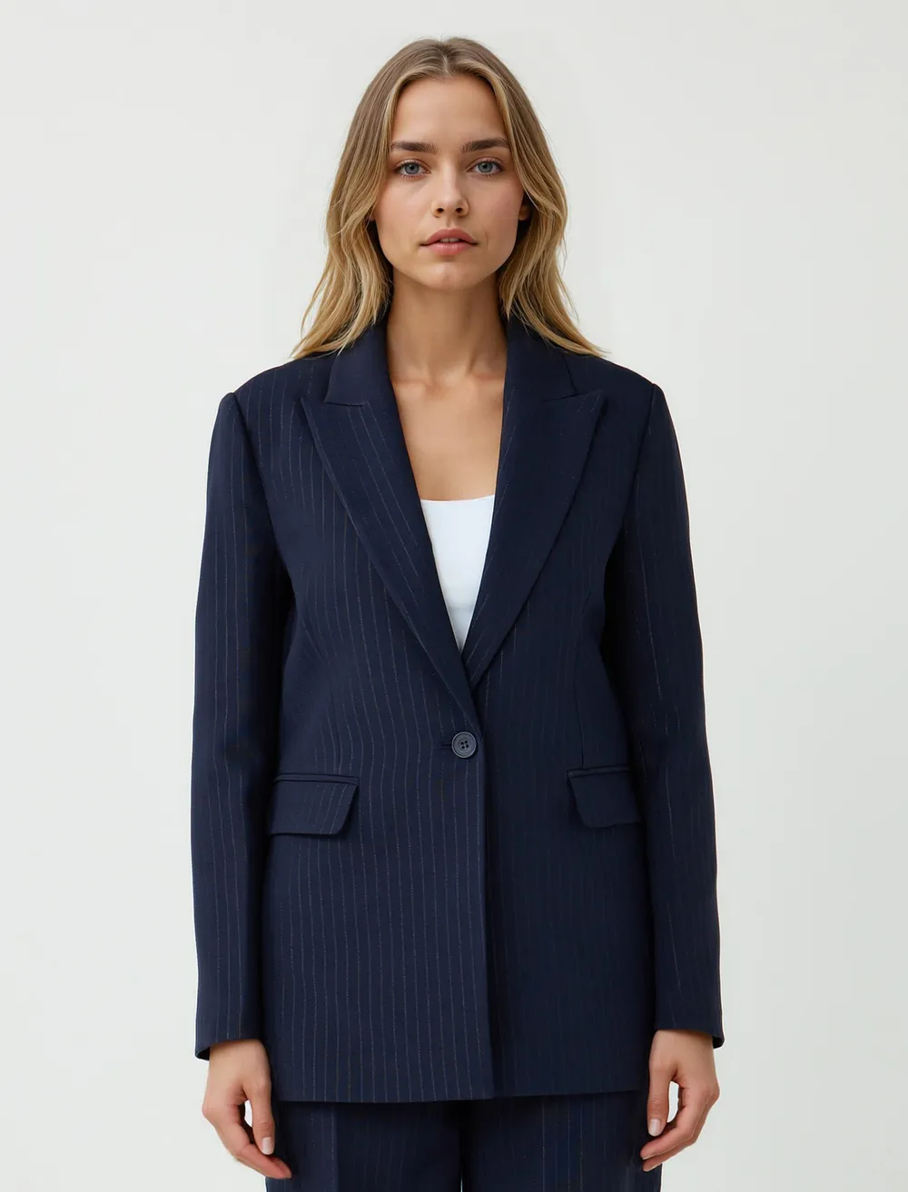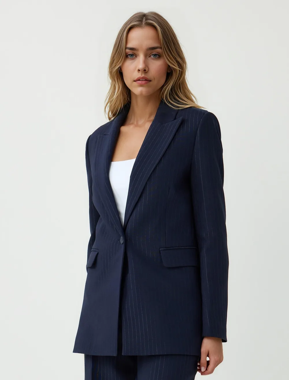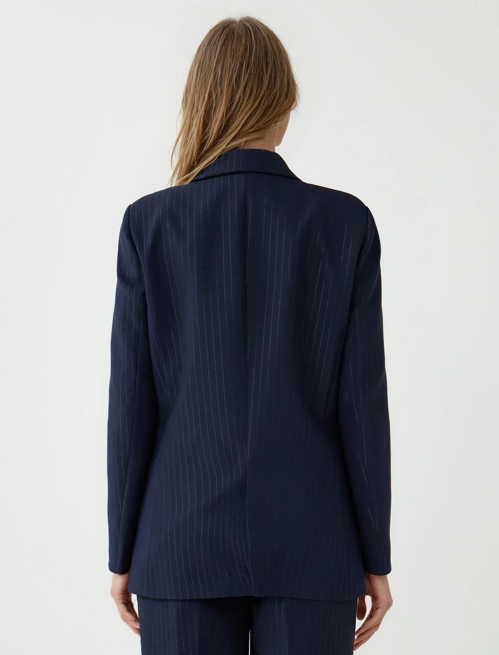 Çizgi Desenli Uzun Kollu Dokuma Kruvaze Ceket