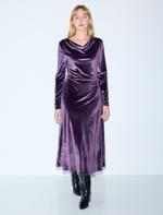 Mor Dökümlü Yaka Uzun Kollu Örme Kadife Uzun Elbise