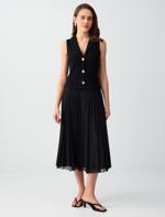 • Bayan Siyah Düğme Detaylı V Yaka Kolsuz Örme Midi Elbise