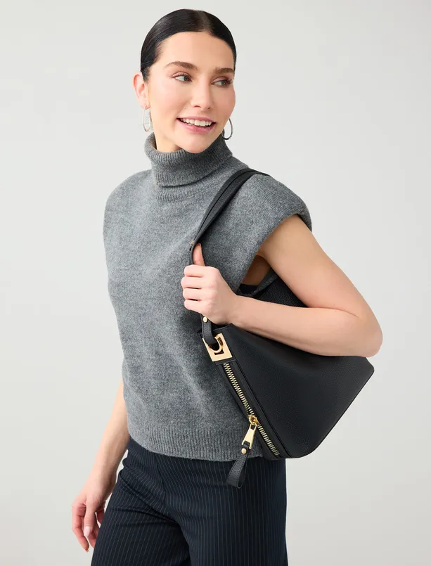 • Bayan Siyah Fermuar Detaylı Deri Görünümlü Çanta