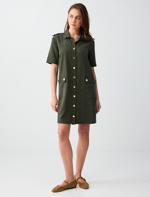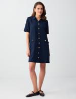 • Bayan Lacivert Gömlek Yaka Kısa Kollu Cep Detaylı Dokuma Mini Elbise