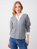 • Bayan Gri Gömlek Yaka Yumuşak Dokulu Saç Örgü Desenli Kazak