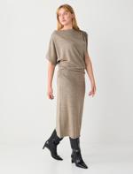 • Bayan Bej Melanj Kayık Yaka Büzgülü Düşük Omuz Triko Midi Elbise