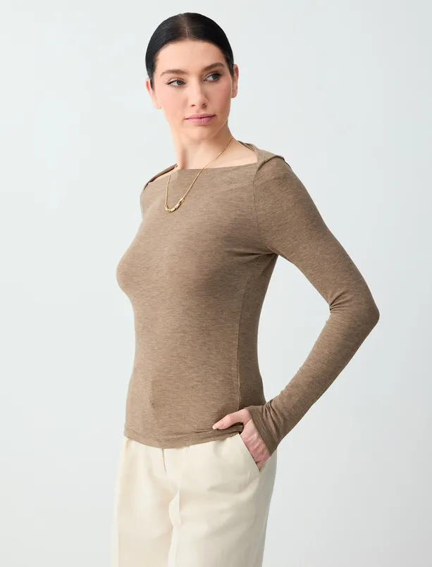 Bej Melanj Kayık Yaka Uzun Kollu Örme Bluz