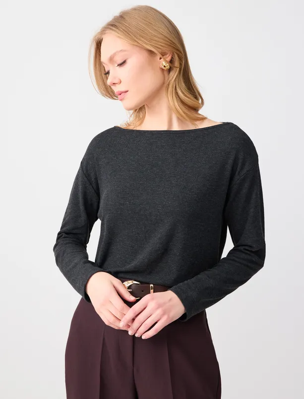 Antrasit Kayık Yaka Uzun Kollu Yumuşak Dokulu Örme Bluz