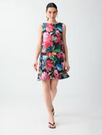 • Bayan Siyah Keten Karışımlı Çiçek Desenli Kayık Yaka Mini Elbise