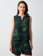 Koyu Yeşil Keten Karışımlı V Yaka Kolsuz Desenli Dokuma Bluz