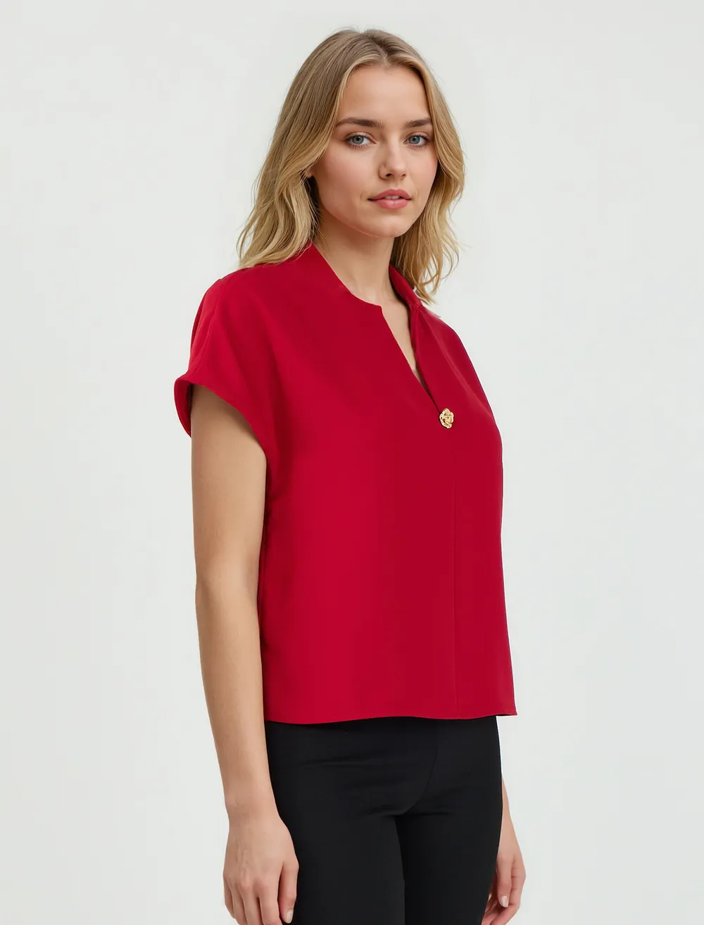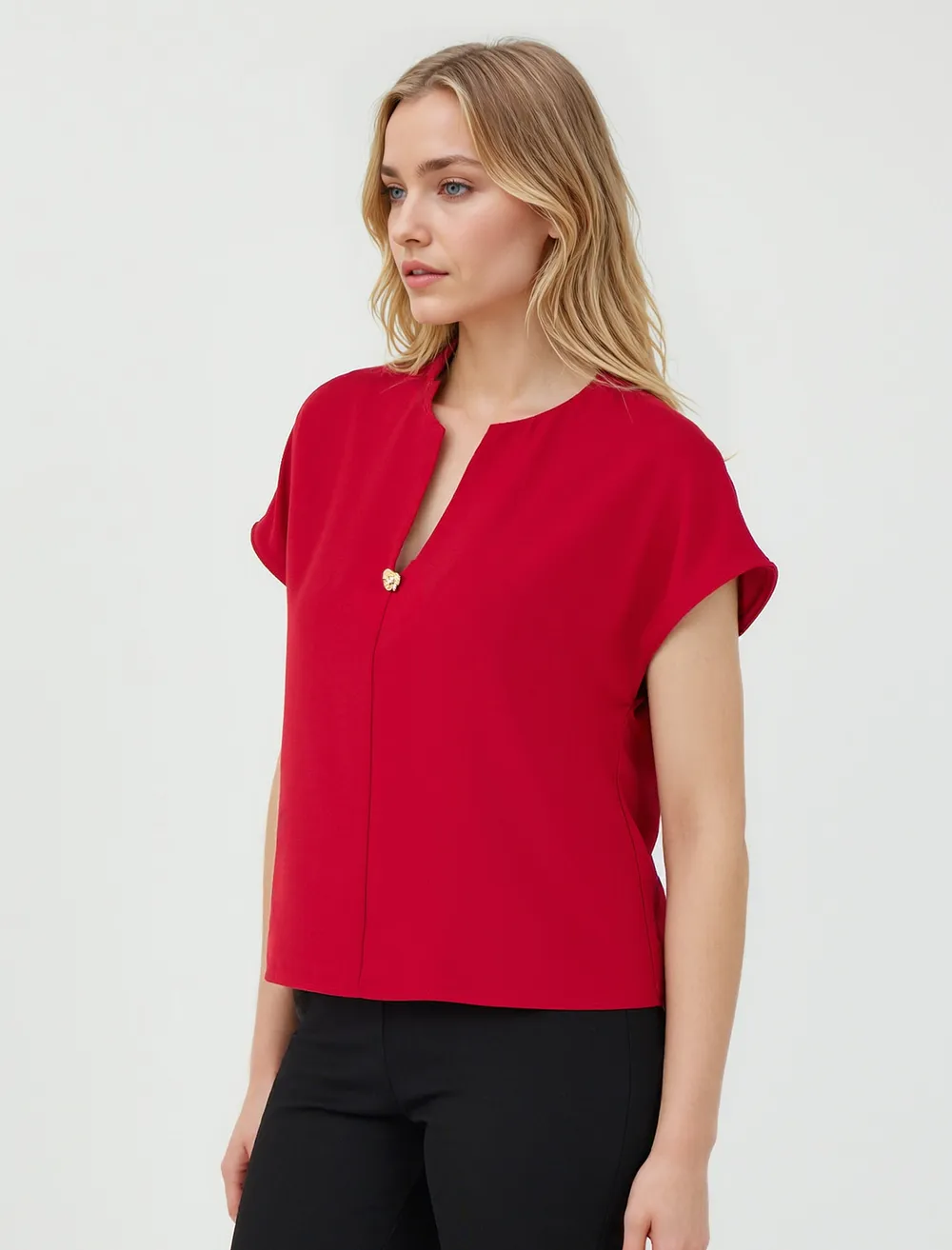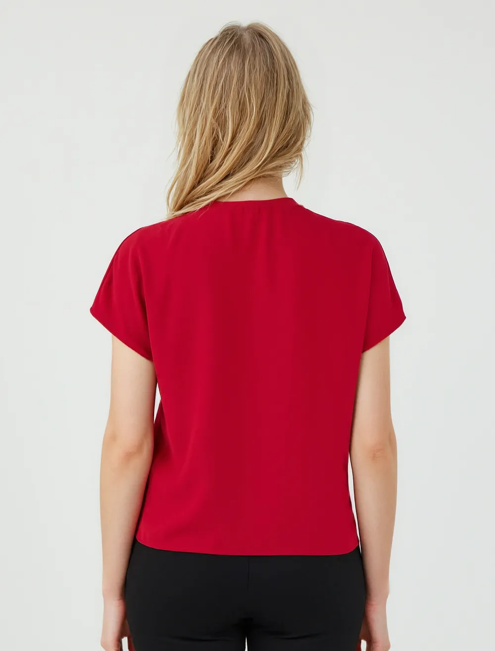 Kırmızı V Yaka Kısa Kollu Dokuma Bluz