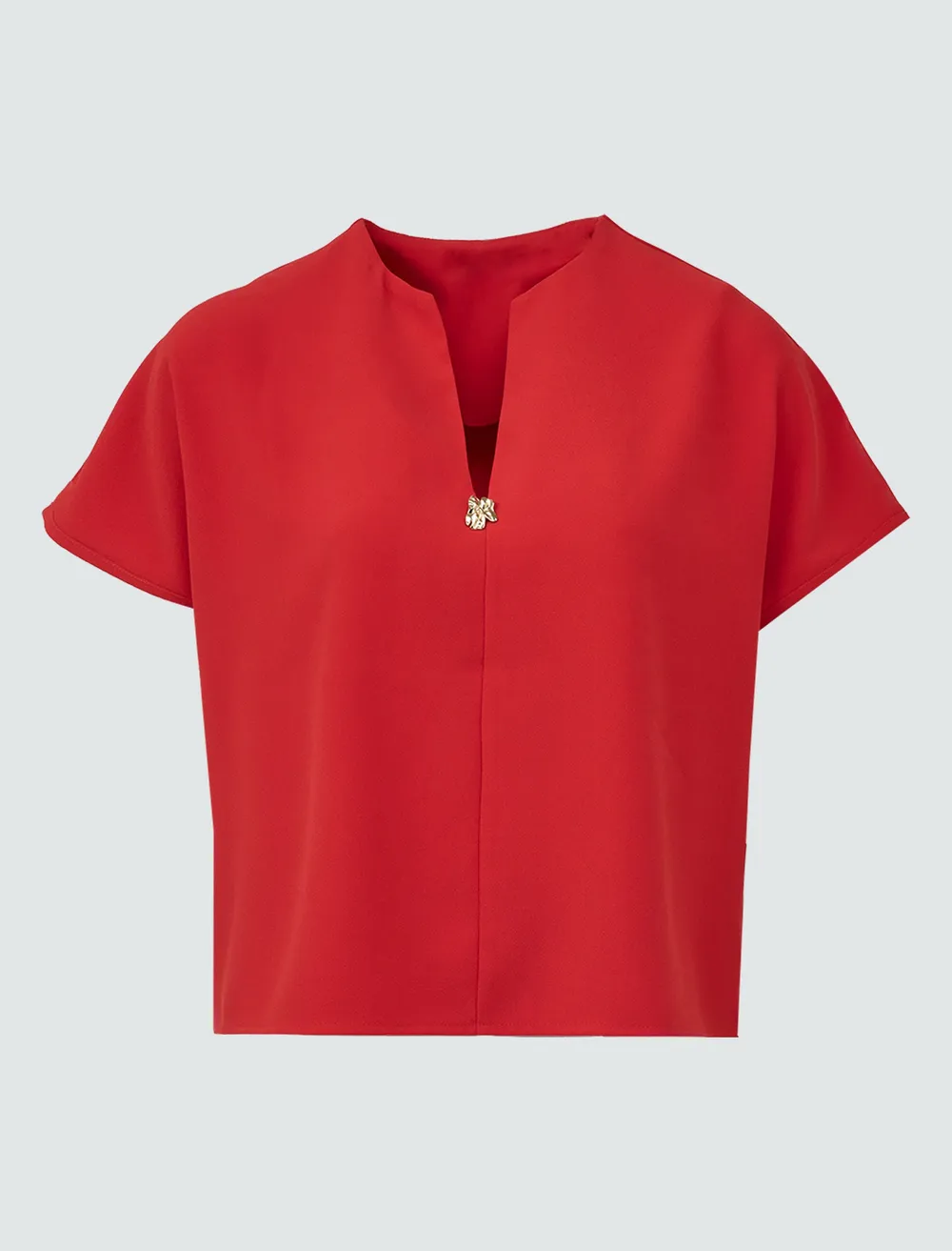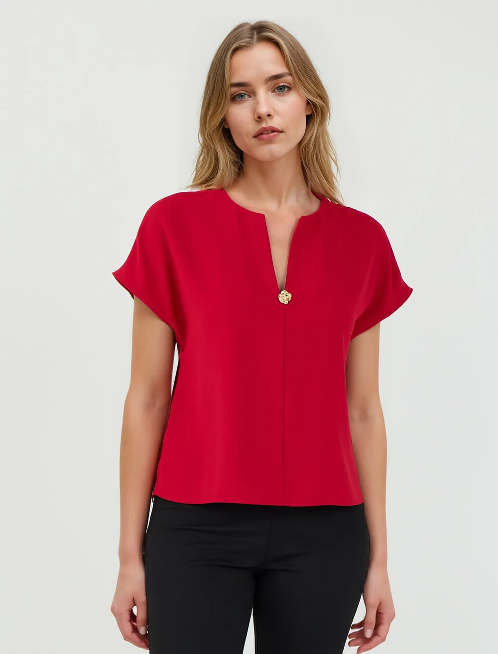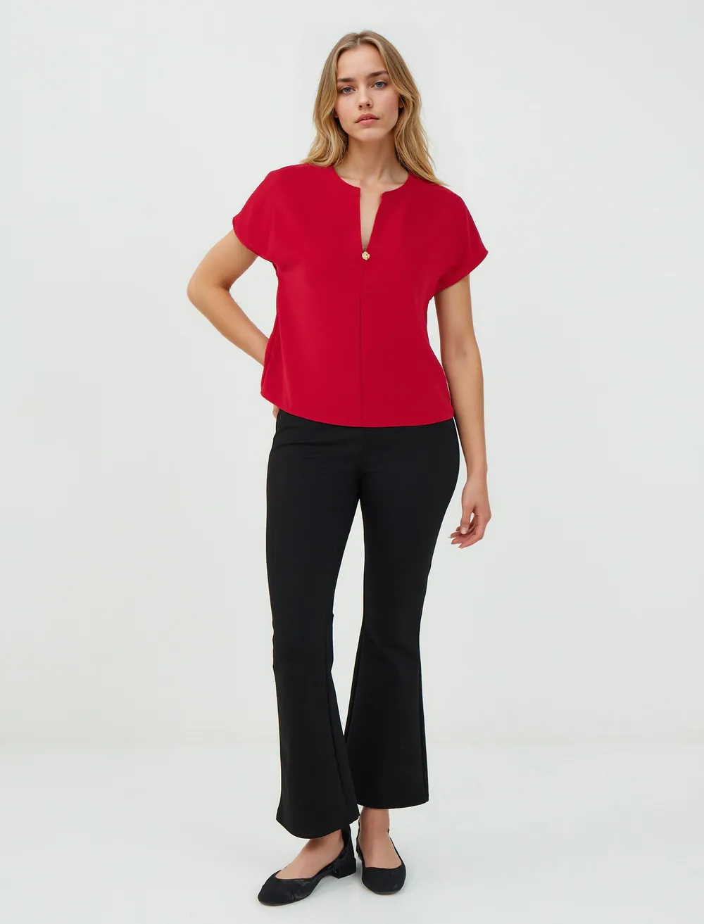 Kırmızı V Yaka Kısa Kollu Dokuma Bluz