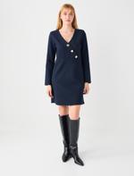 Lacivert Kruvaze Yaka Vatkalı Uzun Kollu Örme Mini Elbise