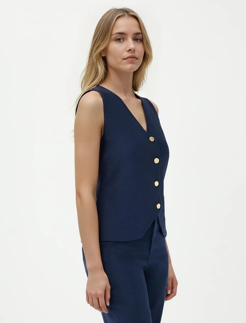 Lacivert Dar Kesim Parlak Düğme Detaylı Triko Yelek Kombini