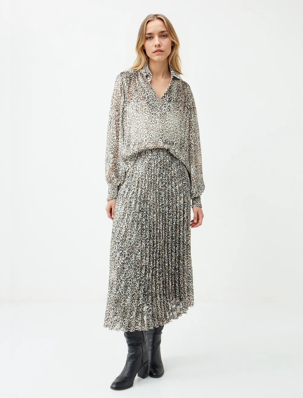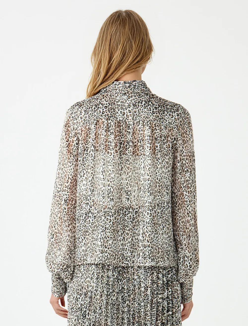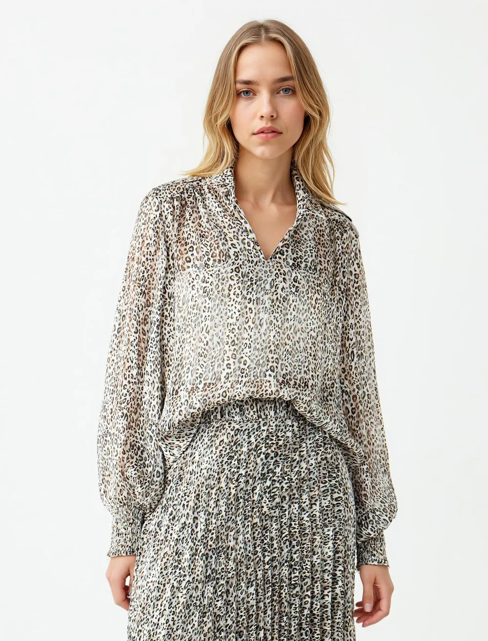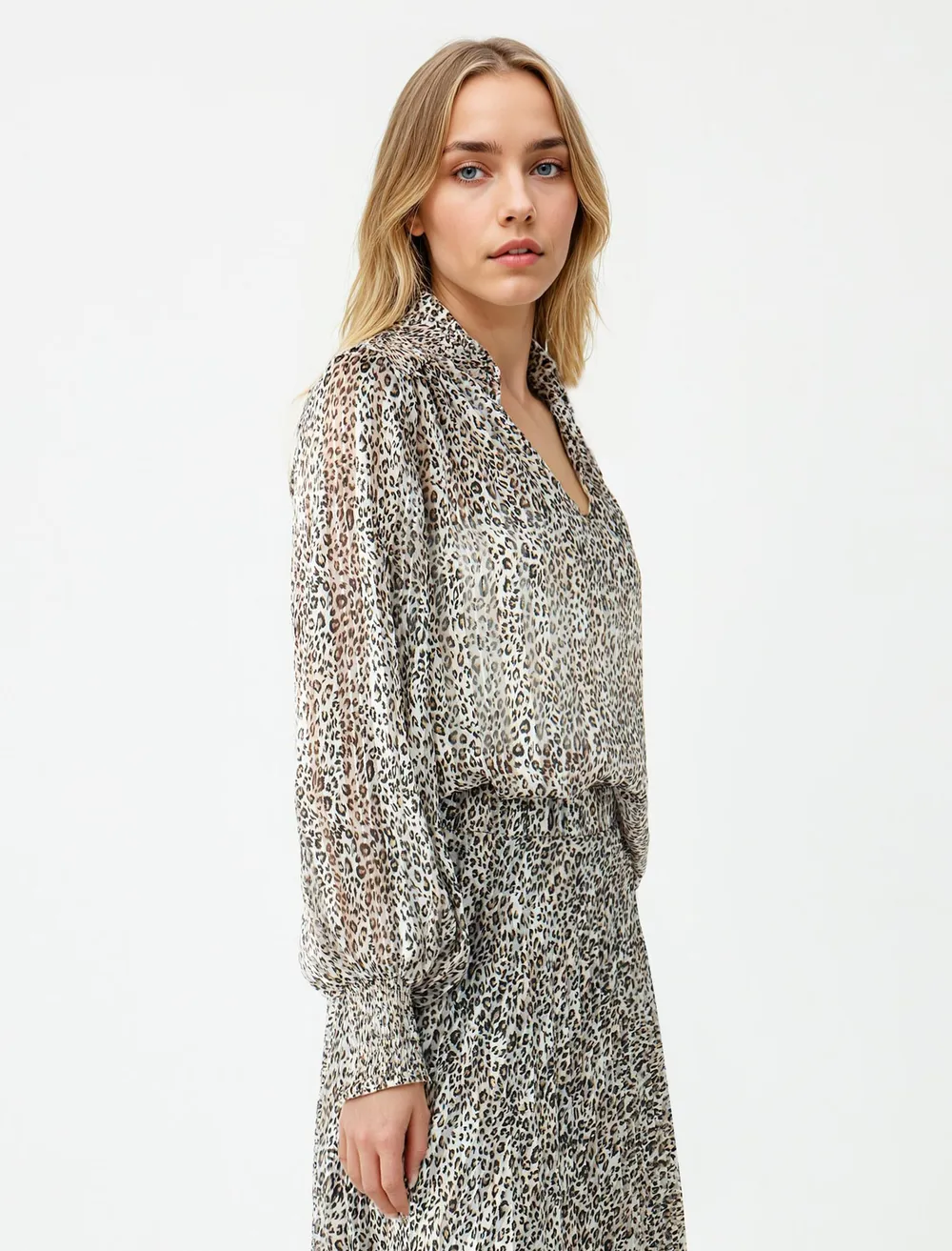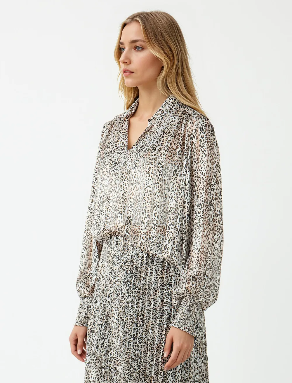 V Yaka Uzun Kollu Leopar Desenli Şifon Bluz