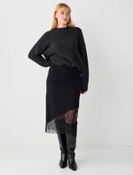 • Bayan Siyah Normal Bel Yumuşak Dokulu Dantelli Midi Etek
