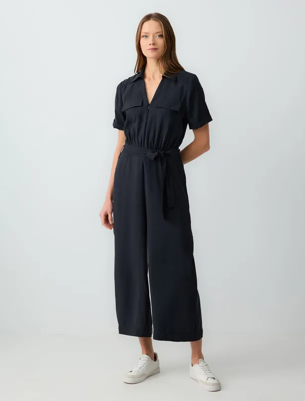 Siyah Polo Yaka Kısa Kollu Beli Kemer Detaylı Dokuma Tulum