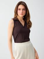 Kahverengi Polo Yaka Kolsuz Dar Kesim Örme Bluz