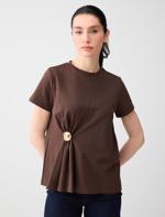 • Bayan Kahverengi Rahat Kesim Bisiklet Yaka Büzgülü Örme Tişört