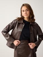 • Bayan Kahverengi Rahat Kesim Deri Görünümlü Cep Detaylı Ceket