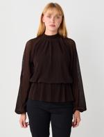 Kahverengi Rahat Kesim Dik Yaka Desenli Mesh Örme Bluz