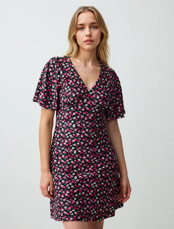 Pembe Rahat Kesim V Yaka Kısa Kollu Desenli Mini Örme Elbise