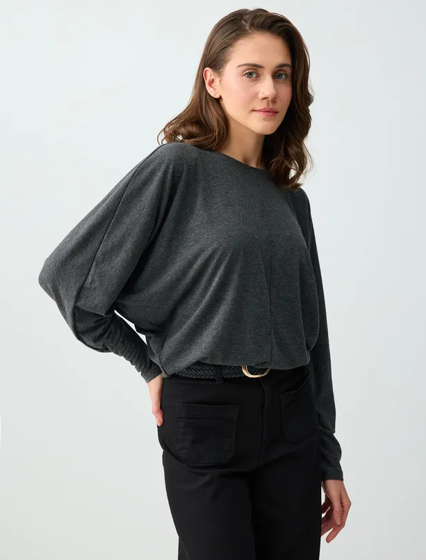 Antrasit Melanj Rahat Kesim Yarasa Kol Sıfır Yaka Örme Bluz
