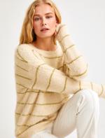 • Bayan Ekru Sarı Çizgili Kalın Dokulu Triko Kazak