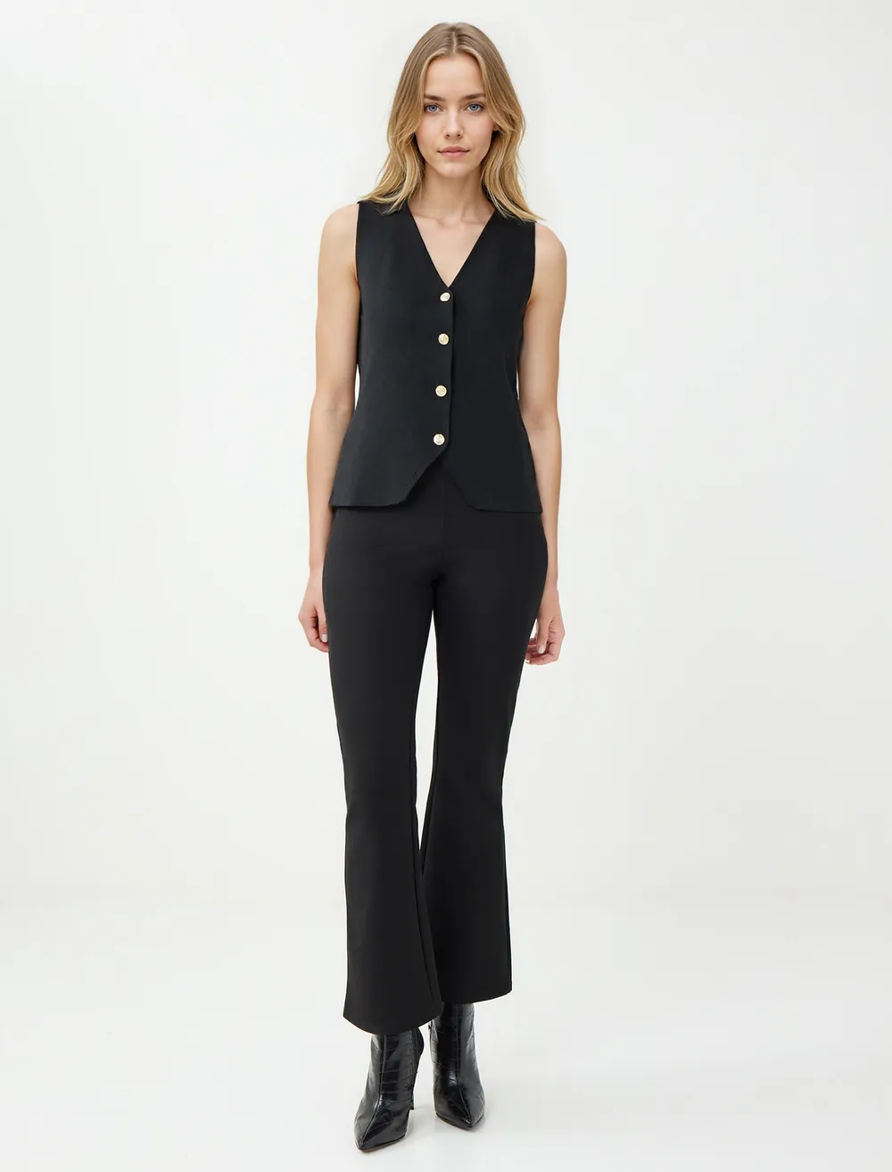 Siyah Dar Kesim Parlak Düğme Detaylı Triko Yelek Kombini