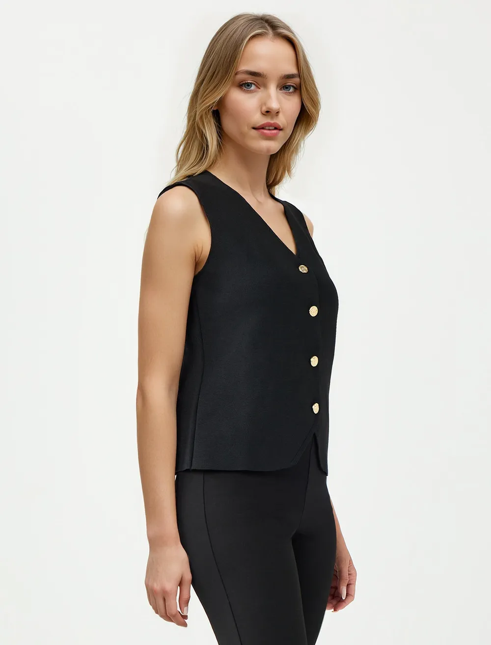 Dar Kesim Parlak Düğme Detaylı Triko Yelek