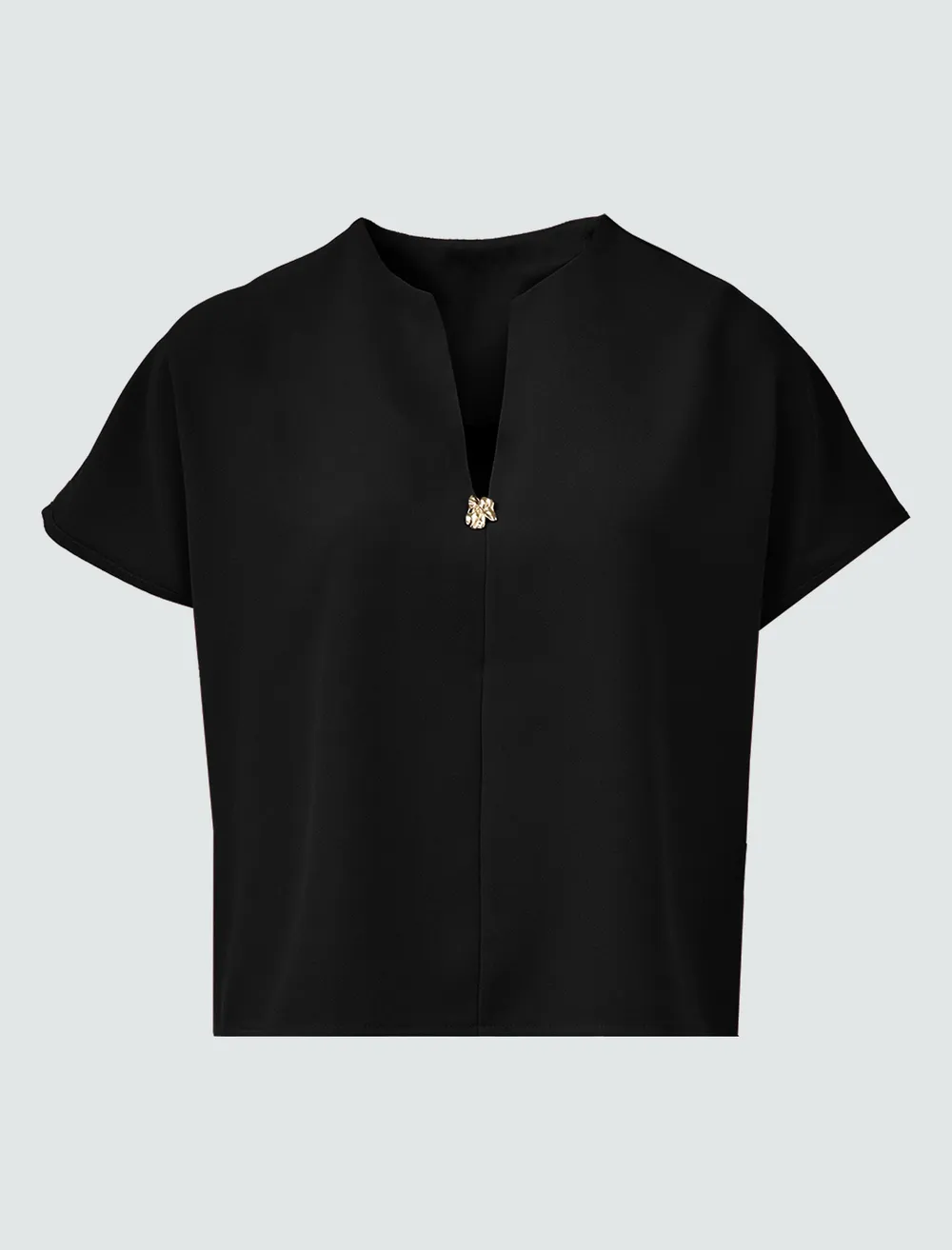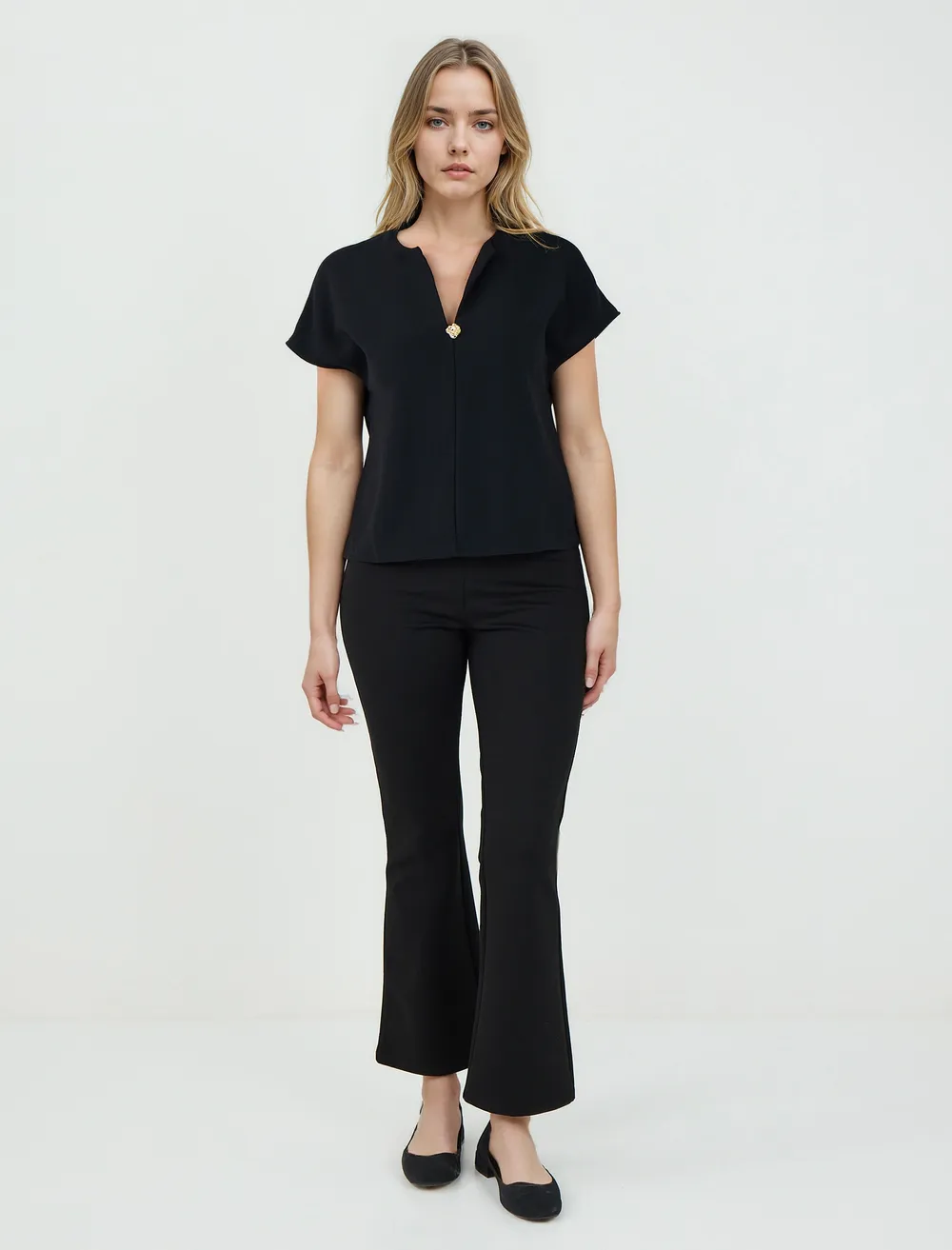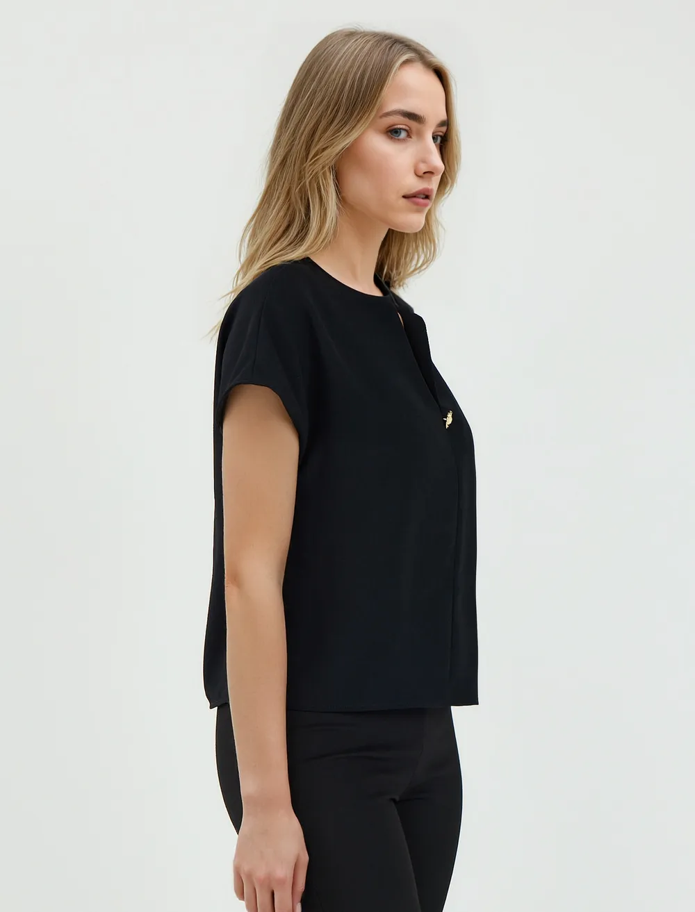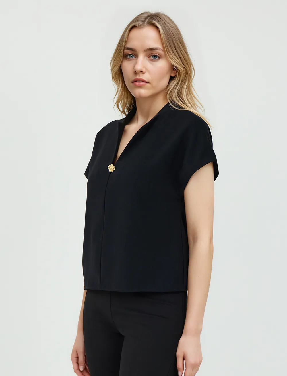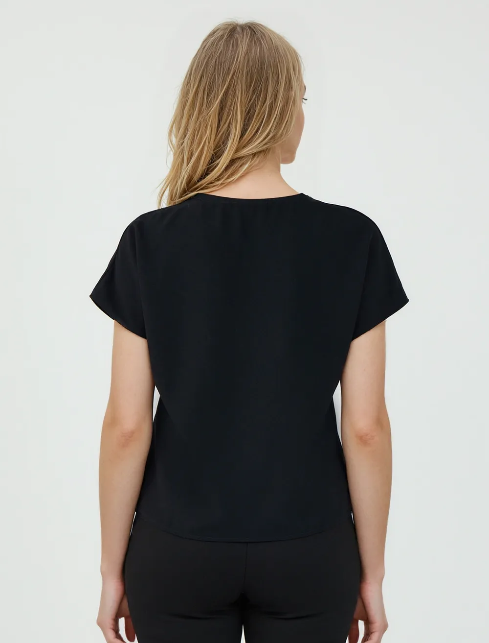 Siyah V Yaka Kısa Kollu Dokuma Bluz