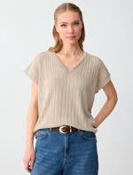 • Bayan Bej Melanj V Yaka Düşük Omuz Rahat Kesim Triko Bluz